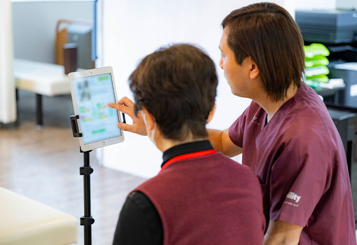 タブレットやスマートフォンで歩行の様子を撮影し、映像をもとに歩行速度やバランス、左右差などを客観的に評価する動画歩行分析サービスです。専門的な装置を使用せず、短時間で状態を確認できるため、リハビリの効果確認や経過観察に活用されています。